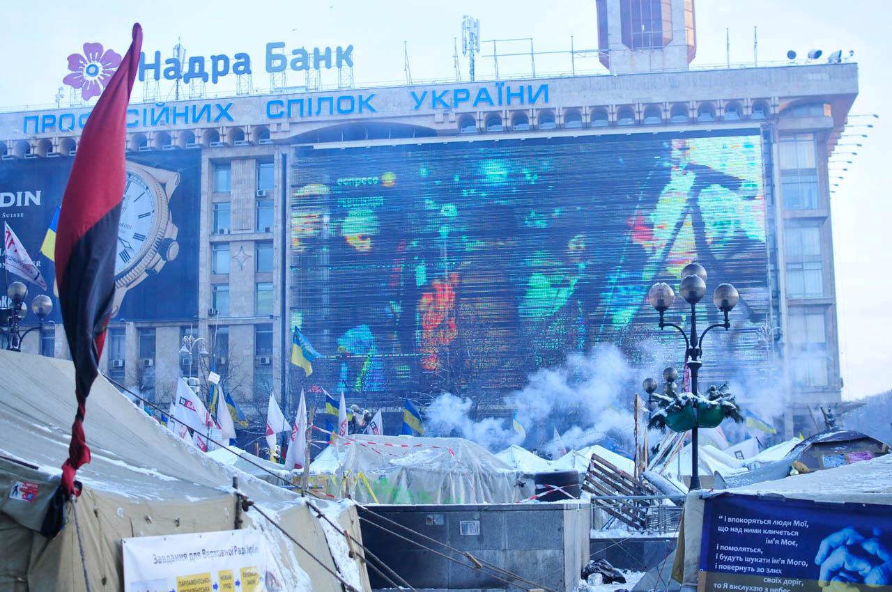 The whole central square of Kyiv, Ukraine has been turned into a city of tents. Fires are burning in barrels to keep the people warm, as it's -20C during the day. Food is being handed out by volunteers. Politicians hold speeches on the stage. A big screen is covering the side of a building, providing video of the screen to everyone in the crowd. Having just flown in from Bangkok, I try to find a place to sit down and figure out what exactly is going on.
