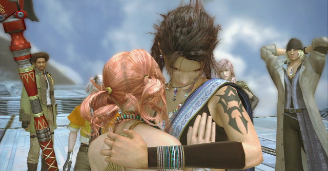 Now back to the characters. Oerba Yun Fang, as previously noted, is the strongest character in the game and the best Commander. A strong fighter from Gran Pulse, Fang is fiercely devoted to one thing: her childhood friend/sister/lesbian lover Vanille. Her one moment of childlike irrationality is when she refuses to abandon her Focus to destroy Cocoon in Chapter 10, but that was just yet another painfully forced plot point in order to have her summon Bahamut (just as with the first appearance of the other summons, most notably Hope’s Alexander). I would not consider Fang as strong a female character as Lightning, however, mostly due to the fact that Fang does not have the same character development. Fang pretty much exists as-is, and doesn’t change. Still, her personality and competence make her a change of pace from most female characters of the first ten FFs.