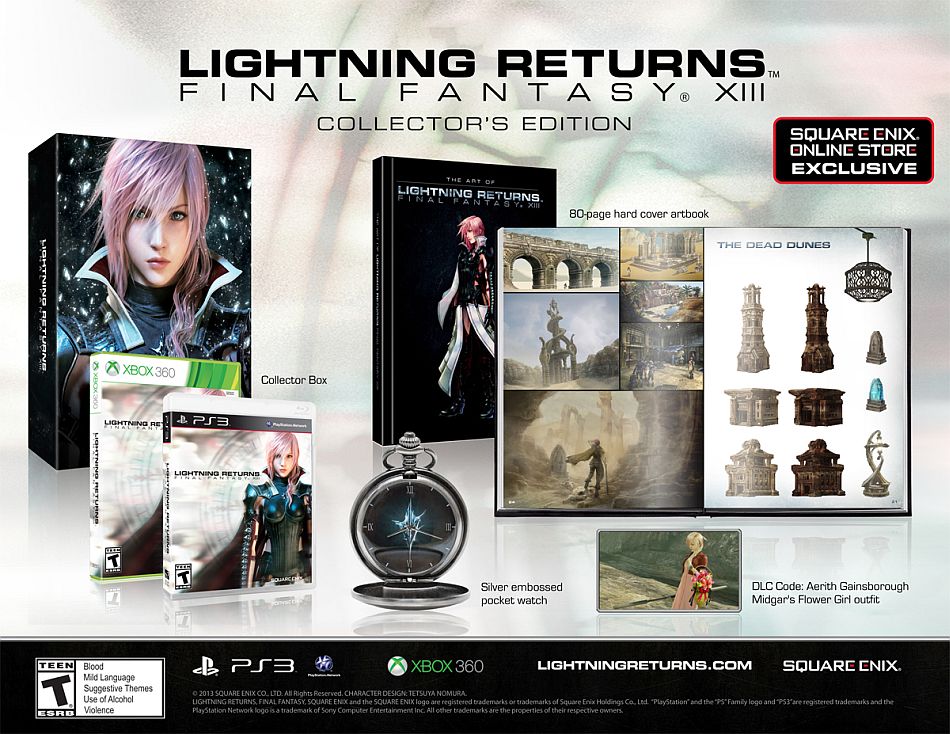 The Piède de résistance of this collector's edition is a silver embossed pocket watch featuring the Lightning Returns ensignia and a DLC code for the Aerith Gainsborough's "Midgar Flower Girl" costume, which was previously only available as an exclusive bonus in Japan.