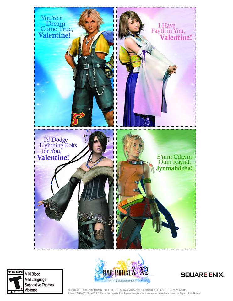 First off, Square Enix has provided us with the perfect Valentines Day cards to give out to your crushes. Just print them off, pick the one you want and share the love with your awkward laughing lover.