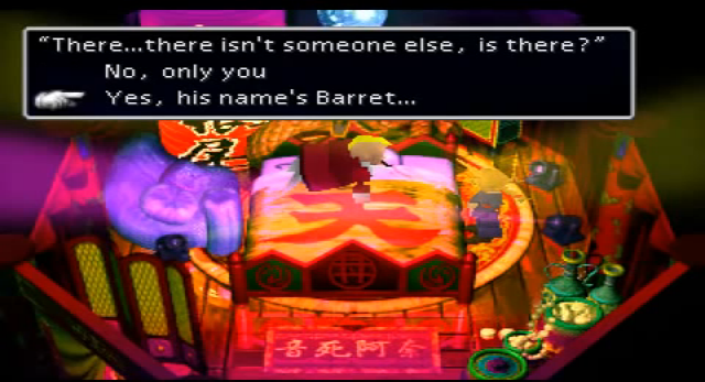 The two then begin to discuss the ladies of Final Fantasy VII, presumably to reassert their masculinity. After discussing Tifa, Aeris, and Yuffie, Barret for some reason jumps to the conclusion that Cloud must be a pedophile. I'm guessing because of the hair.