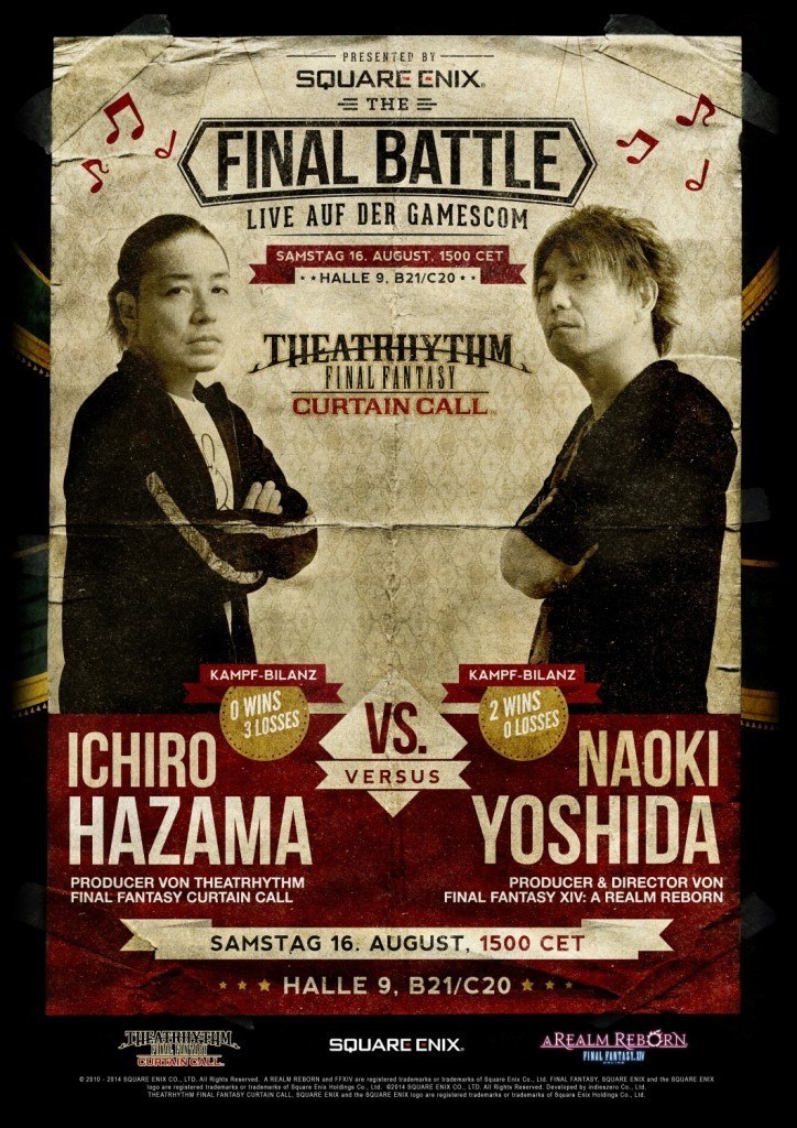 What else? There's more? Yes! The epic battle between Final Fantasy XIV: A Realm Reborn producer and director Naoki Yoshida and the producer of Theatrhythm Final Fantasy: Curtain Call Ichiro Hazama will happen! They will be fighting using Theatrhythm's new Versus Mode! So check it out if you have time to tune in. Who do you think will win? Tune in at 3pm CEST on Saturday 16th August.