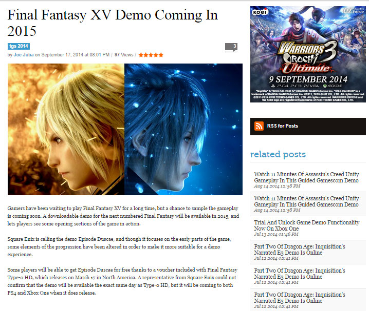 The announcement of a Final Fantasy XV demo arriving in 2015 has spread like wild fire! Game Informer broke the news this morning in an article that has since been deleted, leaving many to speculate why it was taken down so quickly. It's worth pointing out that Game Informer is a long running reputable website, so even if you want to take this news with a grain of salt for the moment, it may just be worth getting your hopes up.