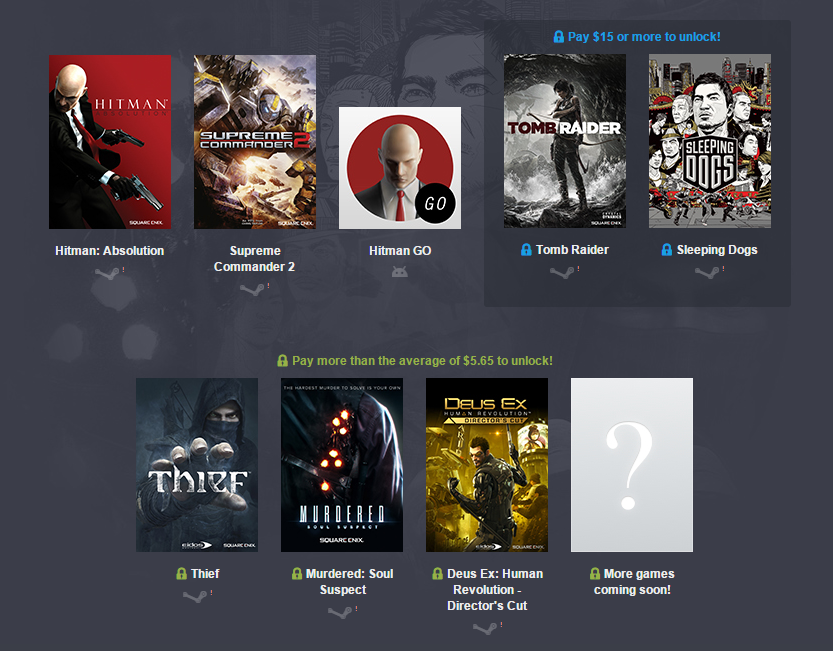 Pay $1 or more for Hitman: Absolution, Supreme Commander 2, and Hitman GO. Pay more than the average price, and you also get Thief, Murdered: Soul Suspect, and Deus Ex: Human Revolution - Director's Cut. Pay $15 or more, and you get all of that plus Tomb Raider and Sleeping Dogs.