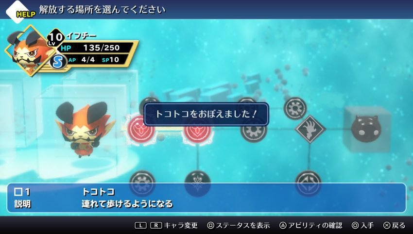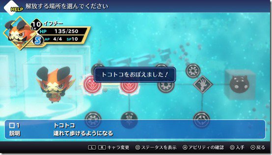 Using the Mirage Board, you can add new abilities and increase parameters for your befriended Mirages. As shown in the above image, it shows paths for unlocking abilities and power-ups. Each space uses up SP (Skill Points) to unlock, and there are some that require special conditions to unlock as well. As long as you're taking your Mirages with you, even if you're not using them in battle, they will gain SP and level up! Your abilities will carry over when you get to your next level on your Mirages but you can always revert back for aesthetic reasons. What aesthetic reason welllll....