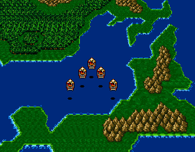 Final Fantasy IV opens up with airships traveling over the world map in a stunning psudeo-3D visual trick accomplished by the Super Famicom's Mode 7 chip. The player is introduced to a number of figures on the ship, but despite all of them being allied together, the player is clued into who the main character is from the start because his sprite design and color are different from his peers. Like film, FFIV tries to tell its story using every aspect of the medium by showing instead of telling. The scene itself fades in, a film transition not really done before in earlier installments or RPGs in general. The game begins not with the soothing Prelude theme but a bombastic military march piece, The Red Wings. Even Final Fantasy IV's version of the main Final Fantasy theme has more of a dark, military styling to it than its previous incarnations. The story of IV unfolds not by some narrator, but by supporting cast members murmuring about the dreadful deeds they had just accomplished, and the guilt they now feel. In this sense, IV is like a play, where a Greek chorus fills the audience in on what is going on, creating context through narration, but disguised as an actual part of the story, as opposed to some unknown omniscient voice sitting you down and explaining the details.