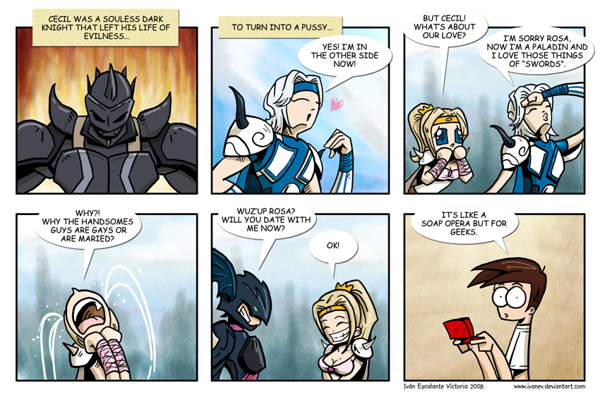 Cecil, then quiets his men and does something unexpected, he has a flashback. Taking cues from film and animation, the scene is played in yellow filter to signify we're seeing a flashback, they didn't necessarily have to do this, but since it is a popular technique in film, they went for it and it gives the scene better clarity. Witnessing this scene, the player is surprised to find out a key piece of information: Cecil is the bad guy. In a reversal from Final Fantasy II's Good Rebels vs. Evil Empire, the player finds themselves in the awkward position of playing some high ranking official in the world conquering evil empire. This is the first time Final Fantasy will use this trope, but by no means will it be the last time. Still, this was quite a bit of a shock back in 1991, as it was generally the norm in games that you are the valiant hero sent forth by destiny itself to save the world, but here the player finds themselves in the role of a conflicted officer in an evil organization. In the first fifteen minutes of Final Fantasy IV, Cecil proves to have more depth and interesting conflict than the medium was able to produce in the decade before it. The extent of Cecil's conflict is played out by the characters around him, and the action he chooses to take. Cecil's discussion with Baigan and the King of Baron showcase that Cecil's been doubting the empire for a while, Kain jumping to his aid when the King strips him of his position says leaps and bounds about their relationship without the need for flashbacks and long winded dialogue, solidifying how he is a comrade for life. Cecil's interaction with Cid and Rosa also detail Cecil's relationships to the Kingdom of Baron and the other cast members and gives us better insight into his melancholic nature.