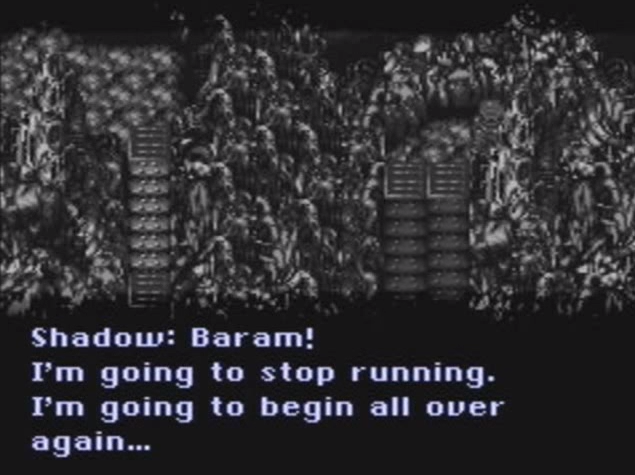 When I began to consider this, I realized that when Shadow tells Terra he has killed his emotions, he isn't just saying something 'badass', his statement comes from his heart and he is admitting something truly terrifying about his character: he, alone in the cast, has given up. He's still running from his past and has chosen to abandon everything and bury his emotions instead of coming to terms with himself. Even Cyan, who is similarly haunted by a nightmare deep inside that eats away at him, finds redemption and the hope of moving on -- Shadow finds nothing. He's abandoned the possibility. He's so eaten alive by the rotten core of what he's done, whether truly terrible or not, that he's effectively jammed. He can no longer progress as a person, and that is the true death of a human.