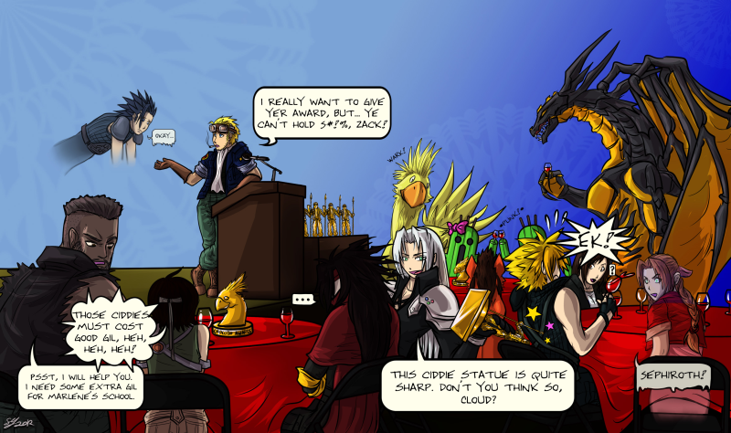 Award Moomba: There's a lot going on in here! It's so nice that the gang from Final Fantasy VII can get together and enjoy themselves during the ceremonies. Just look at poor Zack's spirit denied to hold his Ciddie. Gee, I really love the usage of the speech bubbles here, makes this whole picture so lively!