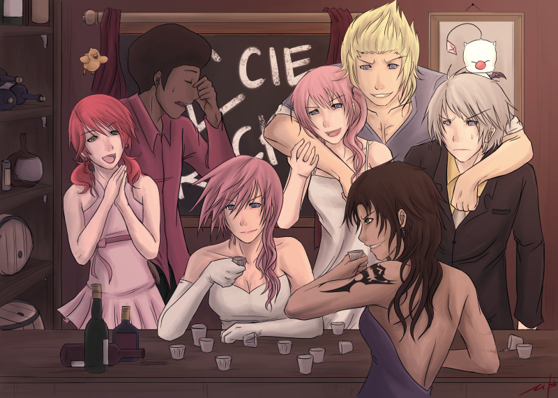 Award Cactuar: I'm glad to see the artist isn't promoting underage drinking, with Hope and Vanille not engaging in alcohol consumption! Poor old Sazh seems to be nursing a nosebleed, but at least that won't show up on his delightful claret shirt.